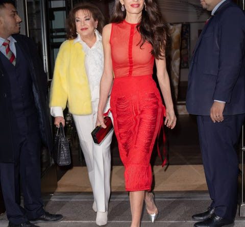 Amal Clooney has spent the last couple days in New York City ahead of the Met Gala, and the human rights lawyer hasn’t shied away from having some major style moments. Last night, Clooney brought out her most striking dress yet, wearing a sheer scarlet dress by SUKEINA out with her mother. Clooney wore a matching statement lip with the look and her brown hair down in waves. She accessorized with silver heels and W. Salamoon & Sons earrings.