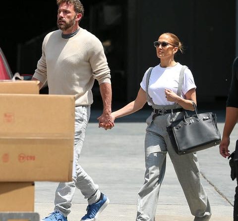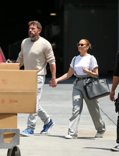Jennifer Lopez and Ben Affleck put their couple dressing on display yesterday when the two were photographed walking hand-in-hand in Los Angeles. Both wore neutral colors, Lopez in a white short-sleeved T-shirt, gray suspenders, and belted gray pants with white sneakers. Affleck, meanwhile, wore light-wash denim pants, a cream sweater, and blue sneakers.