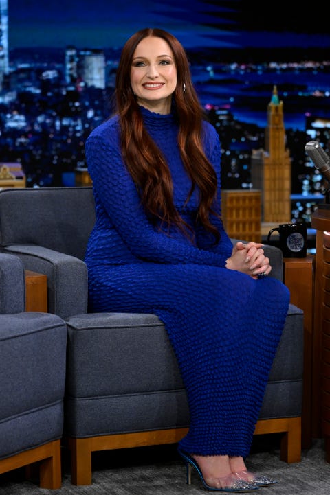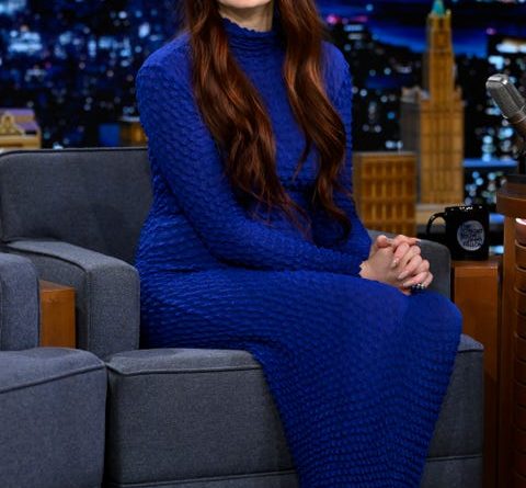 The 26-year-old actress looked stunning during her appearance on The Tonight Show, wearing a textured bright blue dress that clung to her figure, showing off her baby bump, and featuring long sleeves and a mock turtle neck. Under the long form-fitting skirt peeked a pair of Paris Texas heels made from PVC and covered in sparkling crystals, with blue soles to match her gown. She let her dark red hair flow over her shoulders.