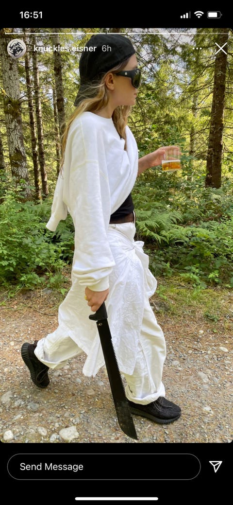 Ashley, meanwhile, is currently dating a 33-year-old artist, Louis Eisner. The two have been photographed together a couple times. After nearly a year not being seen, they signaled their relationship is still on and strong in March 2021 when they were photographed out in New York City on a date. On July 9, 2021, Eisner made a very rare move: posting a photo of Ashley on his Instagram Story. Yes, she’s carrying a beer and machete for reasons unspecified: