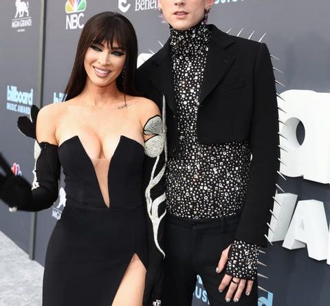 Megan Fox and Machine Gun Kelly leaned into hot black date night attire at the Billboard Music Awards tonight in Las Vegas, with both artists in statement dark ensembles. Fox was a bombshell in a silver flower-accented David Koma black column gown with a thigh-high leg slit. She wore her hair sleek and straight, adding in blunt bangs for the event. Kelly complemented Fox in a black cropped suit jacket and pants adorned with spikes on their sides. His silver sequin-embellished top tied his look together.