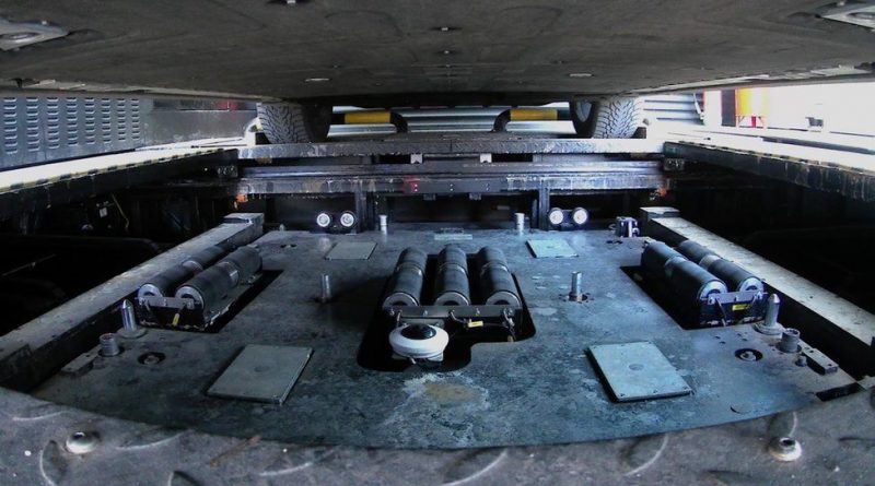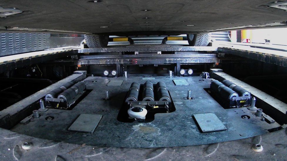 I can hear bolts being undone as the battery is automatically removed from underneath the vehicle and replaced with a fully- charged one.