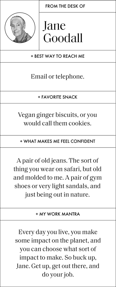 In ELLE.com’s monthly series Office Hours, we ask people in powerful positions to take us through their first jobs, worst jobs, and everything in between. This month, we are featuring Goodall, the inimitable primatologist and anthropologist, who opened up about standing her ground as a young girl, the invaluable career advice her mother imparted, and why tree planting is so “desperately important” for biodiversity.