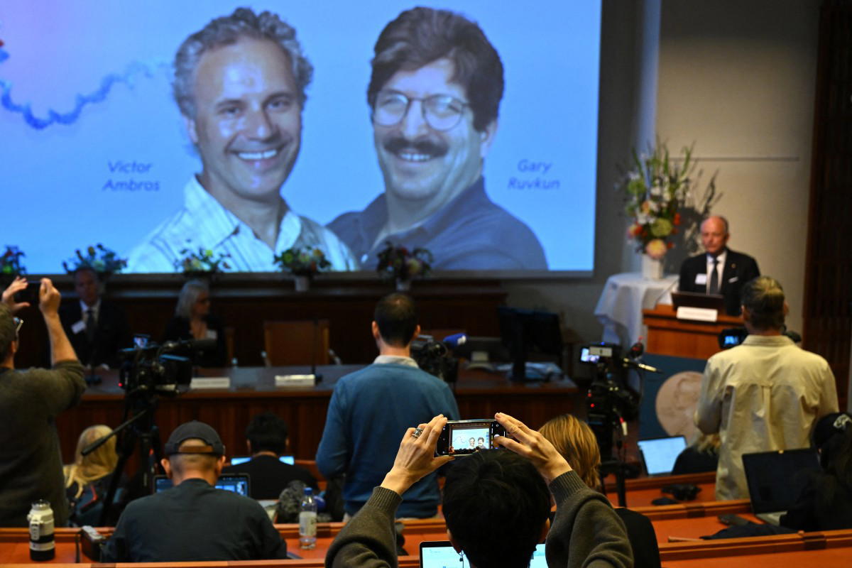 A journalist takes a picture with his phone as Olle Kaempe, member of the Nobel Assembly, speaks to the media in front of a screen displaying a picture of this year’s laureates Victor Ambros and Gary Ruvkum during the announcement of the winners of the 2024 Nobel Prize in Physiology or Medicine at the Karolinska Institute in Stockholm on October 7, 2024. – Victor Ambros and Gary Ruvkum won the Nobel medicine prize on October 7, 2024 for the discovery of microRNA and its role in how gene activity is regulated, the Nobel jury said. (Photo by Jonathan NACKSTRAND / AFP)