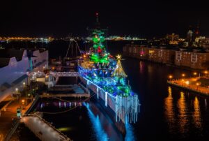 In Norfolk, Virginia, the USS Wisconsin, which participated in the gruesome battles of Okinawa and Iwo Jima, among others, is now the centerpiece of a winter festival featuring visits from Santa and purportedly boasts more Christmas lights than Disneyland. There’s even a bar on board where visitors can sip holiday-themed cocktails.